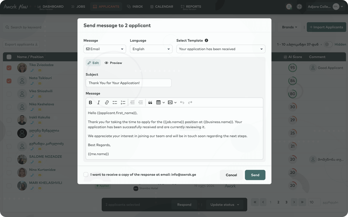 Stay connected with all your candidates directly through our centralized communication features. Send updates, schedule interviews, and maintain engagement.